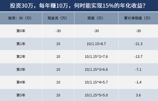 假设年化收益率要求为15%(略高于沪深300指数的长期收益率),折算到当下,第3年其实还达不到15%的收益率,要等到连续第5年稳定盈利才能实现。