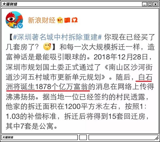 拆迁暴富的极致案例,来自于宇宙中心深圳,白石洲城中村的拆迁补偿的形式是房子+现金,据说直接拆出来1878个亿万富翁。
