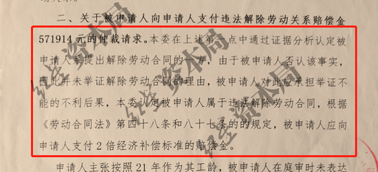 另一位前医药代表郑为清告诉红星资本局,他此前直接被公司辞退。经仲裁委员会裁定,公司属于违法解除劳动合同,应给予郑为清支付2倍经济补偿标准的赔偿金,涉及劳动合同赔偿金37.8万元。