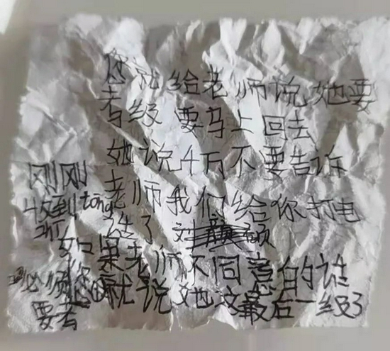 面对家长的询问,小明三缄其口,却偷偷塞给母亲一把纸条,这是其他孩子的求救信息,皱皱巴巴的纸条上满是稚嫩的笔迹,夹杂着拼音。有的孩子由于受到恐吓,让家长找个借口接回自己。从纸条上的字迹和形状不难判断,纸条是孩子们早已准备好的,只是在等待机会。