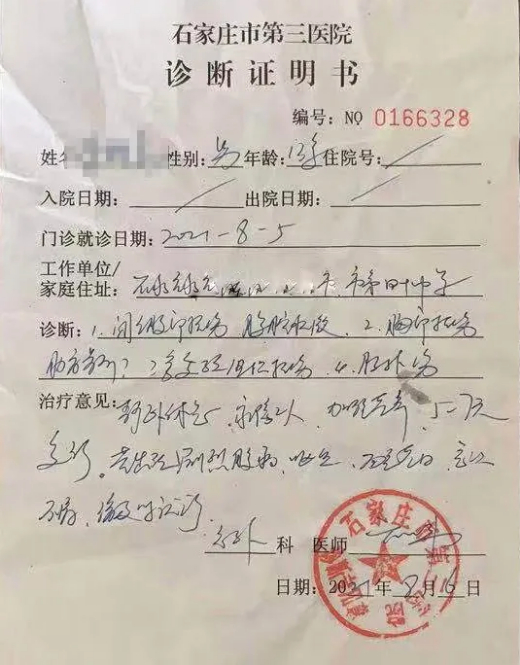 石家庄市第三医院出具的诊断证明书显示,田女士的儿子头部受创,多处皮肤及软组织挫伤,CT诊断报告单显示其盆腔内有少量积液。