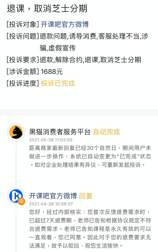 ▲ 申请取消分期付款的投诉被驳回。图 / 黑猫投诉APP截图