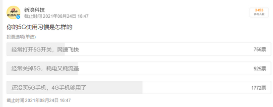 但在这份新浪科技的调查中,截止8月18日晚间有3453名网友参与,其中有1772名网友表示还没有购买5G手机,仍旧在用4G手机,占比高达51.3%。