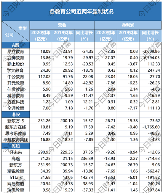 然而,在高涨的投资热情背后,教培机构却面临净利润下滑、增收不增利的窘境。公开资料显示,2020、2021财年,好未来分别净亏损1.28亿美元、1.43亿美元。2020年,昂立教育营业收入18.09亿元,同比2019年的23.91亿元下滑24.35%,净利润则为-2.85亿元。