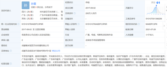 天眼查显示,2017年8月孙雷以200万元资金于成都注册时代星空文化传媒(成都)有限公司,该公司前身为成都糯米饭团文化传播有限公司。公司属性为企业,目前涉及文艺创作服务、教育咨询服务、文化娱乐经纪人等服务,在经营范围里没有涉及艺术培训和儿童相关领域。