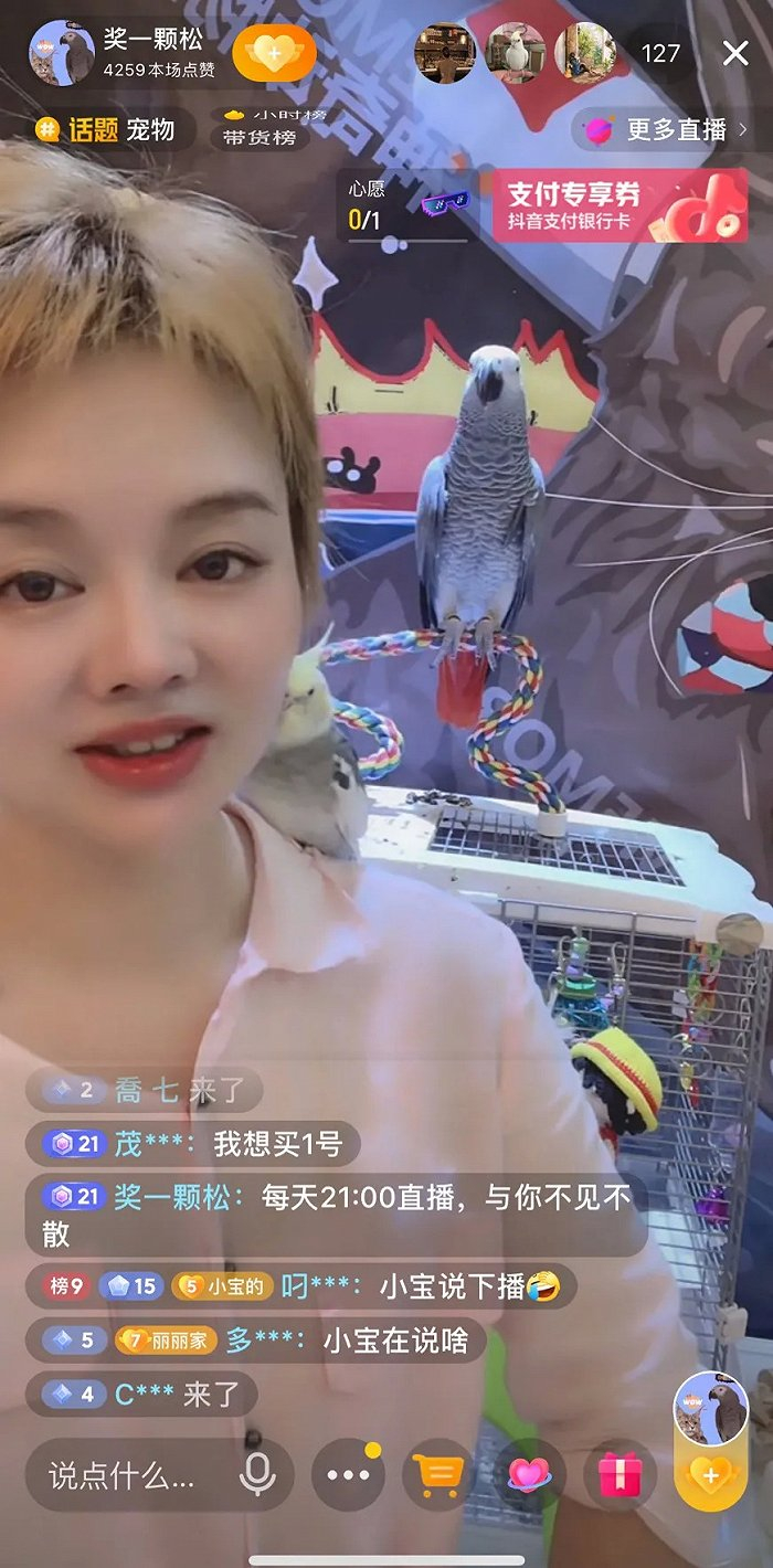 这是主播“奖一颗松”的直播的“撩妹儿”日常,主播小宝,是一位4岁大的灰鹦鹉。