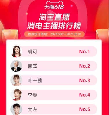 从天猫618数据来看,带货总榜被头部主播霸占,但多个细分领域的TOP1,都是明星主播。食品主播排行榜第一是林依轮,母婴主播排行榜第一是朱丹,消电主播排行榜前五名均为明星,其中胡可、李静、大左为谦寻签约艺人,吉杰为银河众星签约艺人。