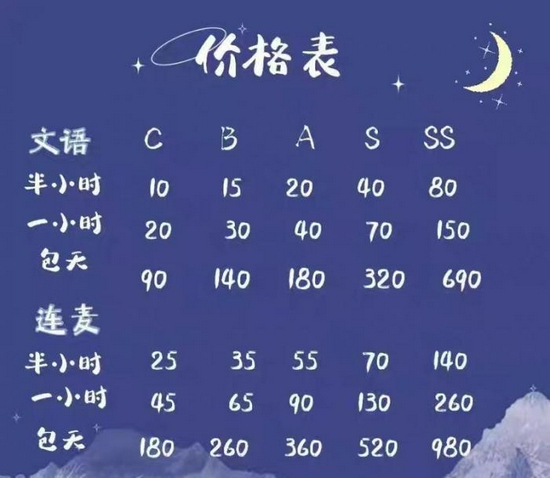目前,大北(化名)所在的店铺将店员分为C、B、A、S、SS级,级别越高,价格越高。半小时连麦价格在25-140元之间,相差近7倍。群里目前共有100多位工作人员,包括全职和兼职,大家可以根据自己的时间自由接单,但每一期(10天)会依据过去10天内的接单数量和金额进行一次考核,考核不过者将会被清退,而接单越多也意味着级别越高。