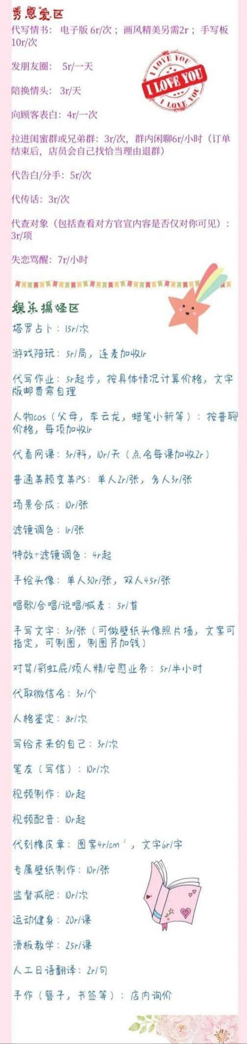 据奚翎介绍,目前馆内除了虚拟恋人服务外,还分为“秀恩爱区”和“娱乐搞怪区”,秀恩爱服务具体包含代写情书、陪换情头、失恋骂醒等,娱乐搞怪服务包括游戏陪玩、唱歌、安慰、监督减肥、运动健身等。