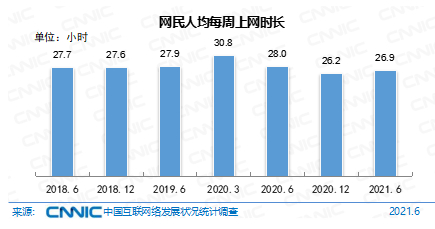 此外,报告显示,截至2021年6月,我国网民的人均每周上网时长为26.9个小时,较2020年12月提升0.7个小时。