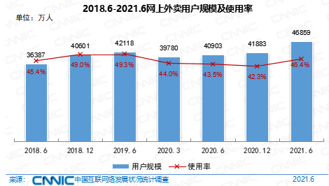 截至2021年6月,我国网上外卖用户规模达4.69亿,较2020年12月增长4976万,在各类调查应用中增速最为明显。随着我国经济活力的全面恢复以及外卖行业监管进一步加强,外卖行业数字化水平不断提升,新消费趋势凸显,行业覆盖内容更加丰富多元。