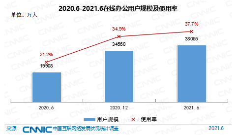 截至2021年6月,我国在线办公用户规模达3.81亿,较2020年12月增长3506万,网民使用率为37.7%。在线办公细分应用持续发展,在线视频/电话会议、在线文档协作编辑的使用率均为23.8%。一方面,随着企业数字化转型不断推进,以在线办公为代表的灵活工作模式将持续创新发展。