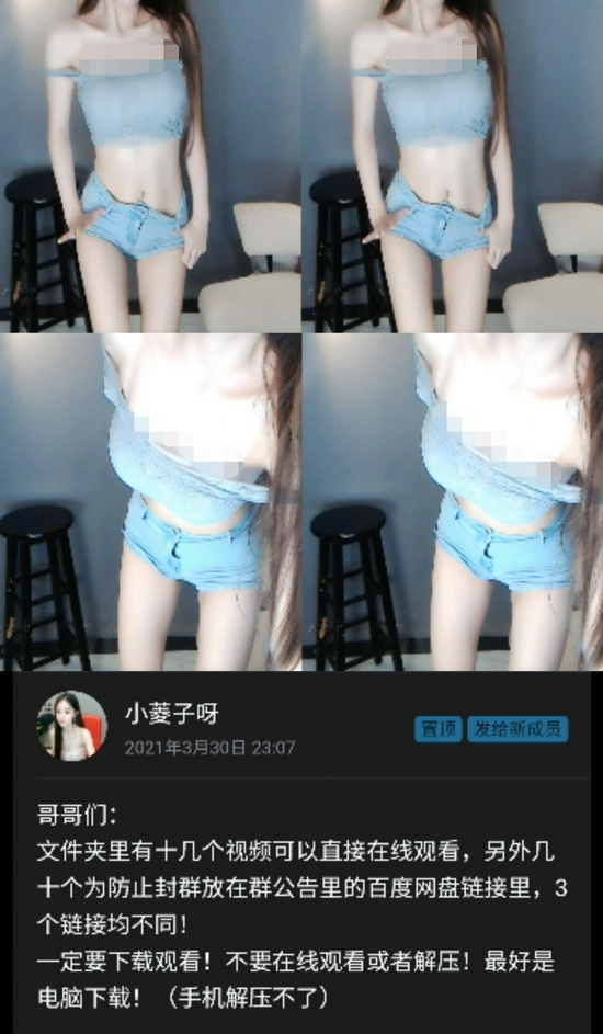 在斗鱼主播“何菱”的直播间,她会诱导观众通过打赏进入粉丝群,尺度相比“大艺术嘉carrie”有过之而无不及,粉丝群中几乎每一条视频都违反斗鱼直播平台相关规定。另一位斗鱼主播“丸子君”,在直播中经常会发出类似“娇喘”等杂音,且刷火箭可以获得定制私人内容,与“何菱”灰色收入的套路同出一辙。