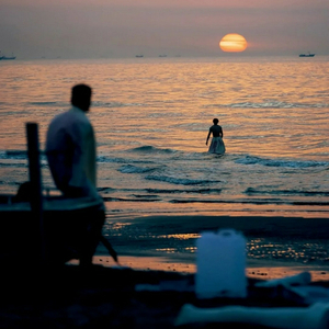 6月12日凌晨三时,戏剧导演陈明昊的《海边的罗密欧与朱丽叶》在海边首演。沙滩为舞台、海天当布景,在阿那亚,剧场和戏剧的形态都有了更多可能性。在这个没有边界的舞台上,巨大的充气丘比特在海边回望着观众,羊群被赶上沙滩,巨大的推土机与拥吻的恋人对抗。