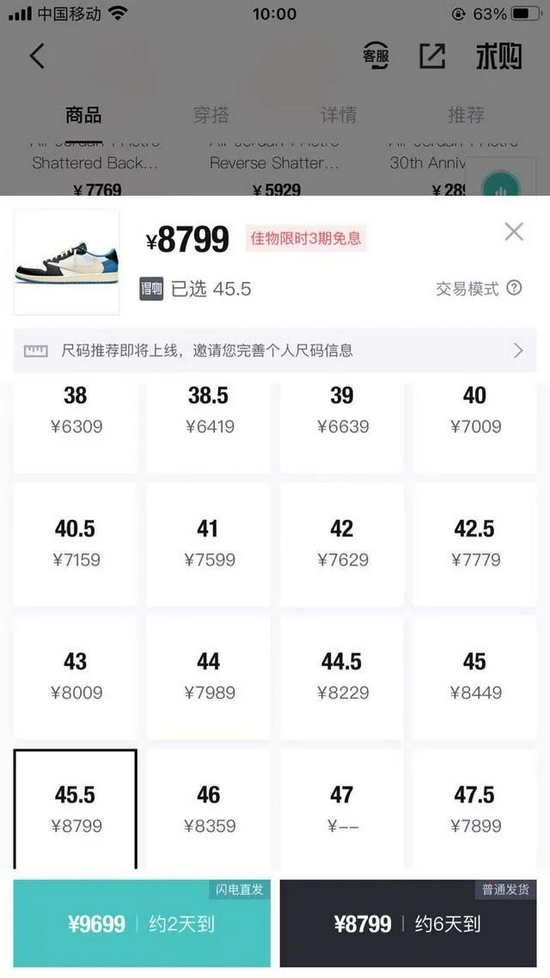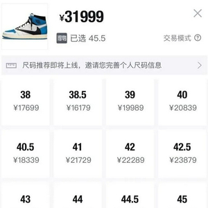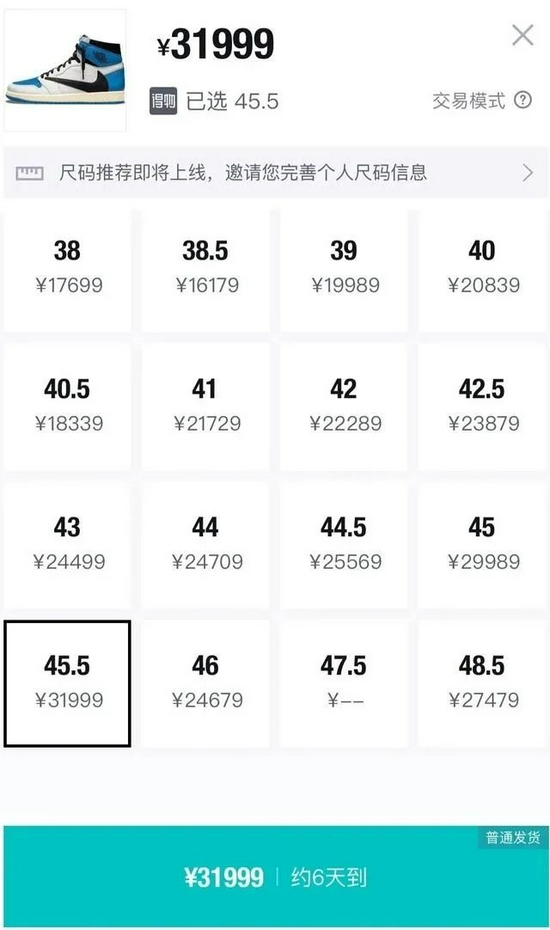 8月30日,北京日报记者注意到,参考发售价格为每双1599元的“倒钩”高帮鞋款,在交易平台上的售价已经飙升至万元以上,尽管以10倍以上的溢价出售。其中,根据鞋码不同,最便宜38.5码售价16179元,最贵的45.5码和47.5码售价均达到31999元,其余码数鞋款售价大多在两万元以上。