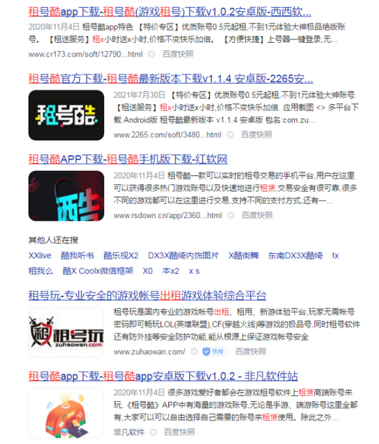 王科告诉记者,在手机应用商店及网页中搜索“租号”,至少有几十个不同的平台,主流电脑端游戏、手机游戏的账号都可以在这些平台上租到。“网上也有特别多租号的渠道,它有大量的App和平台,在应用商城里搜租号,至少有三四十个租号的App,还有网吧,甚至有很多游戏群,还有直播有大量的主播接这样的广告,帮这些租号平台打广告。”王科说。