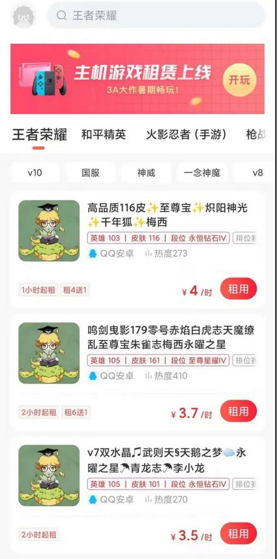 “这太离谱了!”从事IT行业的胡先生十分困惑,儿子却道出实情:在同学的介绍下,他找到一个游戏租号平台租赁了游戏账号。“除了《王者荣耀》外,还可以租到《航海王热血航线》《使命召唤》《火影忍者》等热门游戏的账号。”