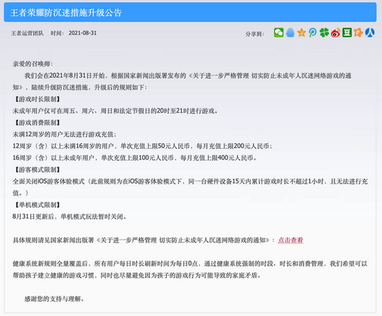 王者荣耀8月31日在官网发布公告: