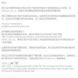 “我们此次联系您是因为我们收到了权利所有者关于侵犯版权的以下举报。在Amazon.com上,卖家不得创建侵犯版权的商品信息或详情页面。”