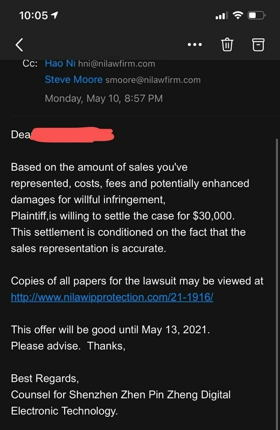 5月10日,林然收到了原告代理律师的和解邮件,和解费用30000美元,林然没有接受;