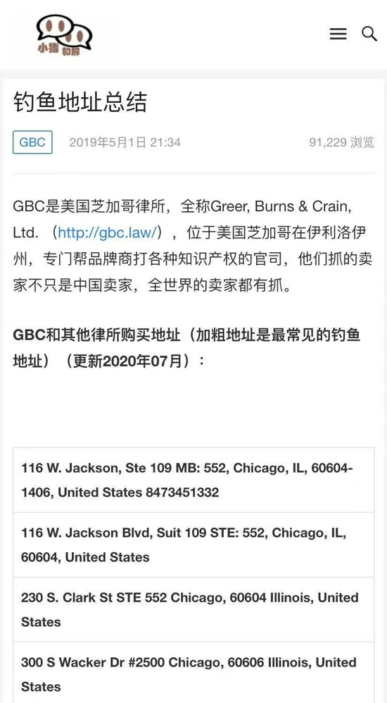 在网上多篇科普如何和解的文章中,GBC(Greer, Burns & Crain)、EPS、Keith、SMG这四家美国律所在中国跨境电商圈 “大名鼎鼎”,文章称,圈内甚至有“不怕不愁店铺不出单,就怕收到GBC投诉函”的说法。