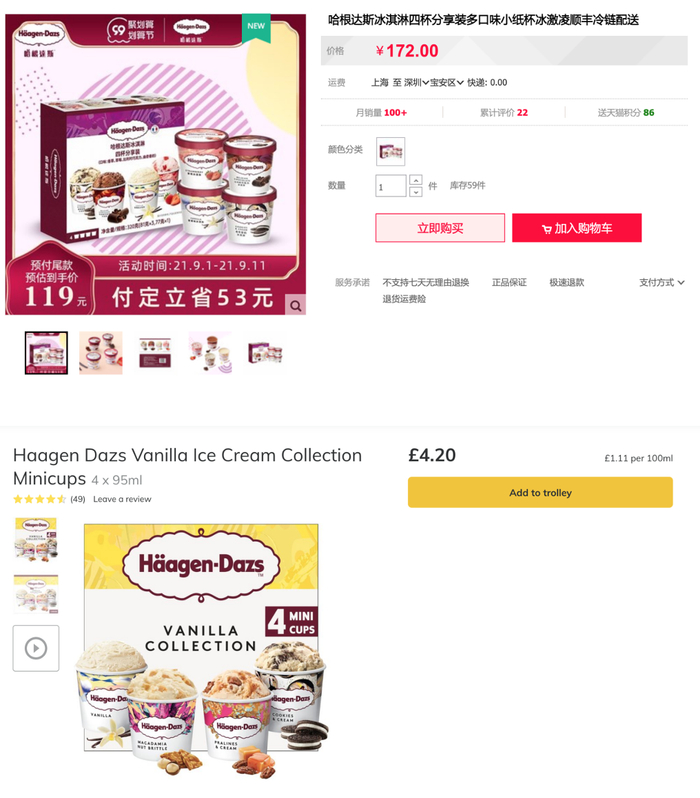 哈根达斯情况类似。天猫旗舰店上,哈根达斯四杯分享装总重320克,售价172元,平均每100克53.75元;而ocado上的同款产品售价4.2英镑(约合37.4元),平均每100克11.65元。国内哈根达斯售价约为英国版的4.6倍。