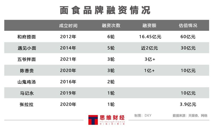2021年以来,包括和府捞面、遇见小面、五爷拌面以及主营兰州牛肉面的陈香贵、马记永、张拉拉均完成了数亿元不等的融资,为他们的门店扩张与市场下沉提供了资金支持。