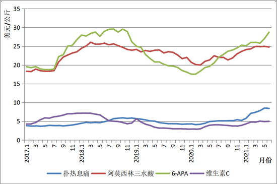 可以看到,2018年我国原料药产量下降对市场的影响得到了充分体现,上述品种的出口价格基本都是在2018年达到了阶段性高点,但随后再次出现下跌走势,并在2020年初见底。如果不是2020年新冠肺炎疫情暴发打破了全球原料药供需平衡,并在我国较好控制住疫情的前提下对我国原料药出口产生了一定的正向刺激,那么上述原料药品种的出口价格很可能继续下跌或在低位徘徊。实际上,即便在疫情的作用下,上述品种的出口价格也仅在去年二三季度小幅反弹,直到四季度才在全球大宗原料和跨境物流大幅涨价的带动下进入了主升通道。