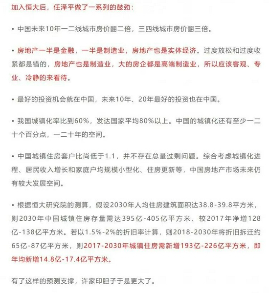 包括在2017年12月以1500万年薪加入恒大后,任泽平陆续发表观点称: