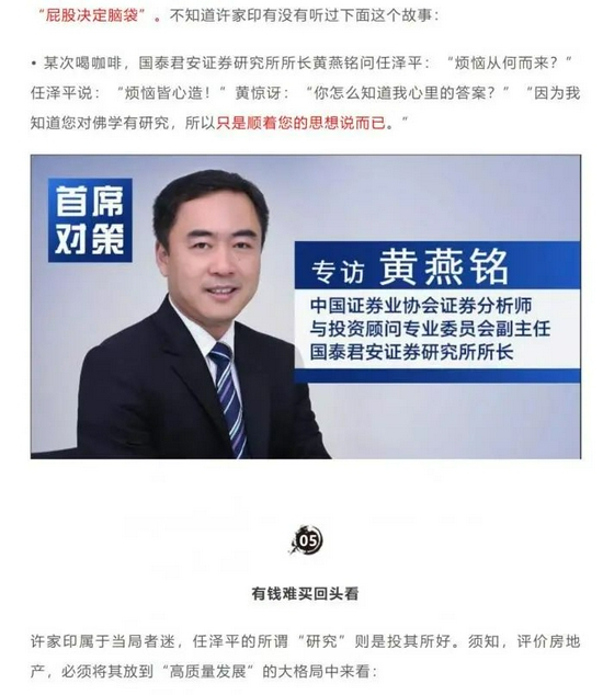 言下之意,任泽平并不是在进行公正理性的宏观研究,而是许家印心里想什么、希望听到什么声音,任泽平就发出什么声音,给许家印的激情点了一把火,放大了其激进。