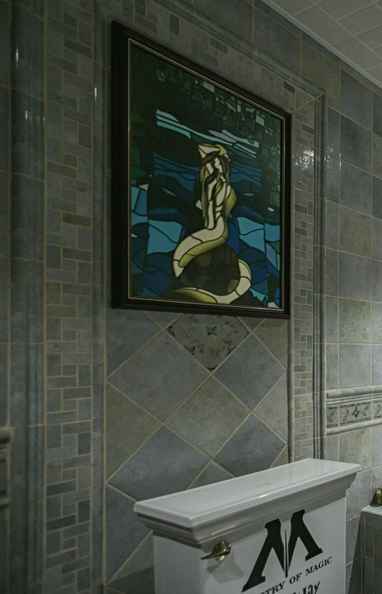 对于哈迷们来说,这些并不便宜的周边产品代表着他们和梦想中魔法世界的一种连接。哈迷“鸡脚”正是其中一位。作为较早接触到哈利波特系列的读者,她的梦想就是把家打造成魔法世界。在她家里,不仅摆满了从世界各地买回来的周边道具,甚至复刻了许多只有电影里才有的魔法场景。譬如在她家的卫生间里,就挂着能显示内心最深处渴望的“厄里斯魔镜”、只会出现在级长盥洗室的“美人鱼”画像和把自己冲下去才能进入英国魔法部的马桶。