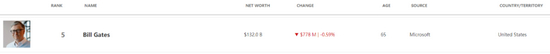 比尔·盖茨目前在实时更新的福布斯全球富豪榜上排名第五,身家约为1320亿美元,约合8500亿人民币。