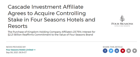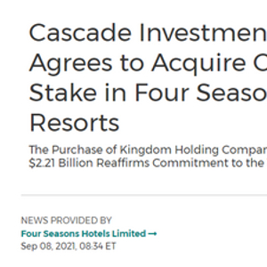 当地时间周三,比尔·盖茨的投资公司Cascade Investment LLC已同意支付22.1亿美元购买沙特王子瓦利德·本·塔拉勒(Alwaleed bin Talal)在四季酒店及度假村集团 (Four Seasons Hotels and Resorts)的一半股份,这笔全现金交易将盖茨的持股比例从47.5%提高到71.25%,巩固了对这家估值为100亿美元的豪华酒店运营商的控制权。该交易预计将于2022年1月完成。