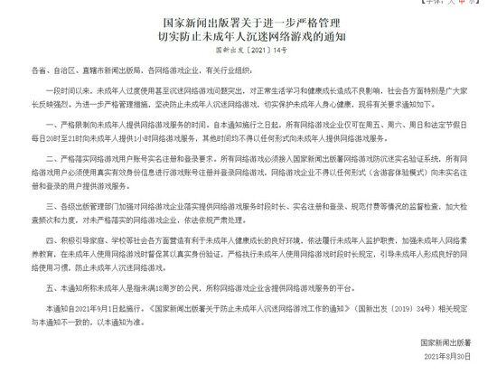 近日,国家新闻出版署下发的《关于进一步严格管理 切实防止未成年人沉迷网络游戏的通知》,要求所有网络游戏企业仅可在周五、周六、周日和法定节假日每日20时至21时向未成年人提供1小时服务,对未成年人玩网络游戏的时间做出了严格限制。