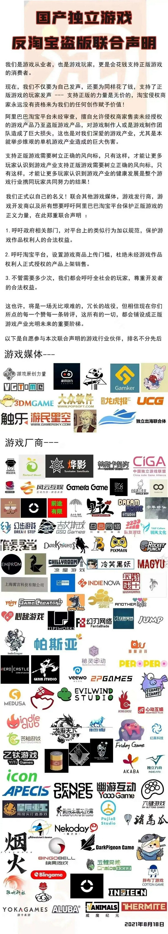 8月18日晚,因申诉旗下手游《波西亚时光》在淘宝平台一再被盗版的问题未果,帕斯亚科技牵头发布了这份《国产独立游戏反淘宝盗版联合声明》,呼吁政府和相关平台保护正版游戏的合法权益,共有近100家游戏开发商参与、20家游戏垂类媒体参与了此次声明。