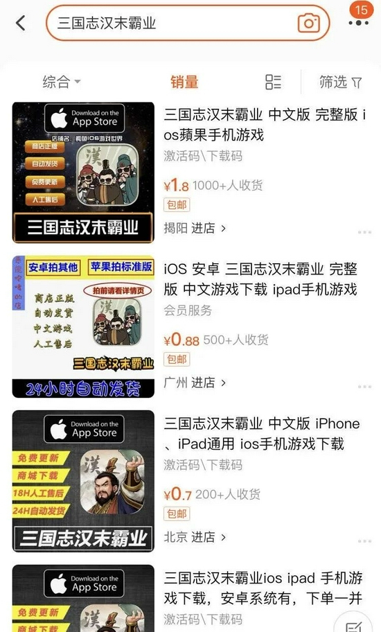 红星资本局注意到,《三国志汉末霸业》iOS版手游的官方售价为88元。而在淘宝上搜索发现,在一个淘宝商家,《三国志汉末霸业中文版》的iOS版手游售价仅为1.60元,交易记录显示该商家已经成交577单,累计评论6064条。