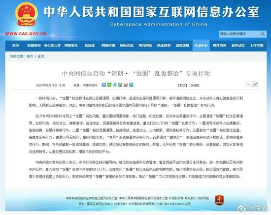 国家互联网信息办公室发布的“清朗·‘饭圈’乱象整治”公告