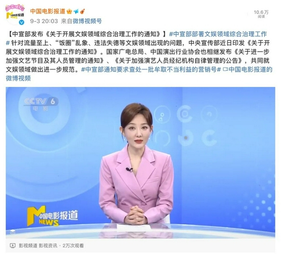 9月3日,《关于开展文娱领域综合治理工作的通知》要求,严厉查处偷逃税行为,有效维护市场秩序,对文娱领域的问题进行规范、整顿。
