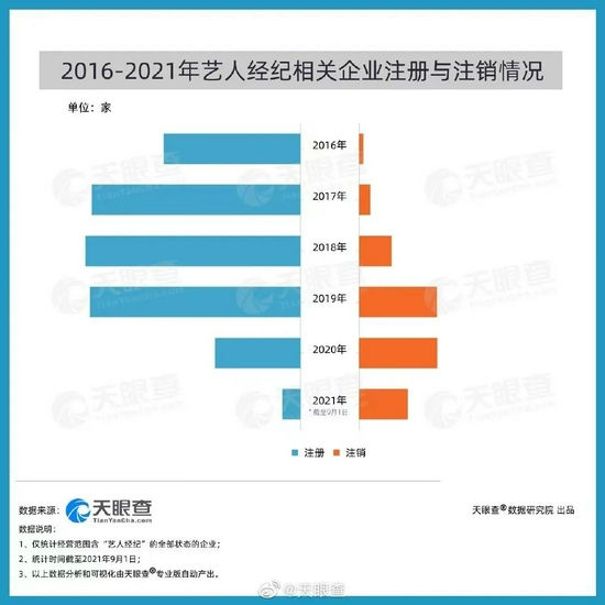 2016-2021年艺人经纪相关企业注册与注销情况(来源:微博@天眼查)