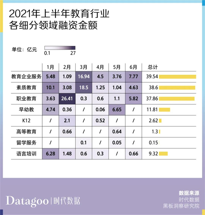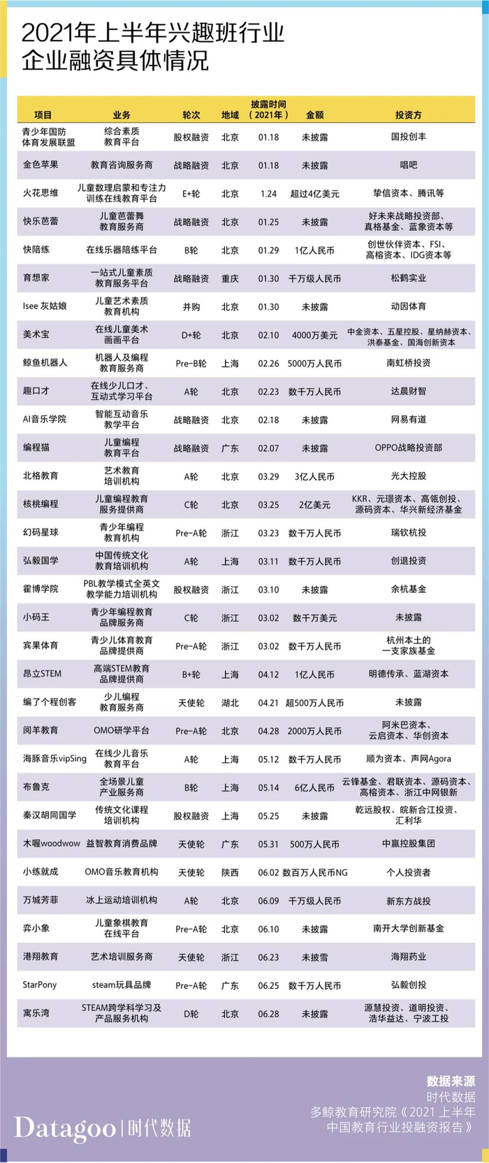 另据多鲸教育研究院不完全统计,上半年素质教育领域在一级市场发生投融资交易至少 32 起,算下来平均单笔融资额度过亿。