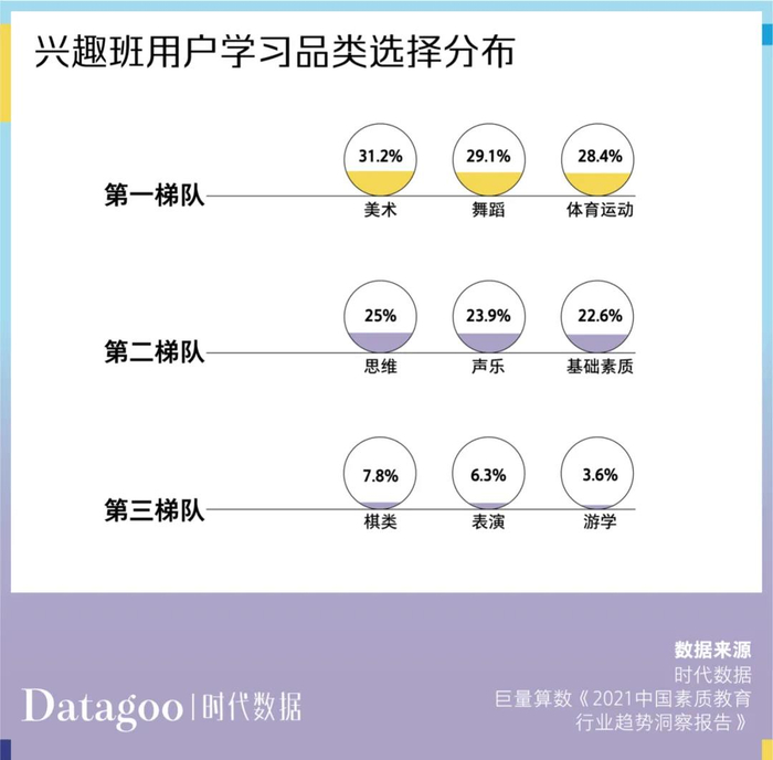 具体到父母或孩子挑选的教育品类,则美术、舞蹈与体育运动的参与度最高,都在三成左右。这也呼应了政策层面对于美育及体育素质的侧重。