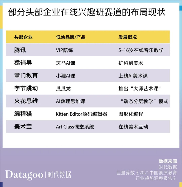 猿辅导、掌门教育、字节跳动、美术宝等纷纷上线斑马 AI 课、小狸 AI 课、瓜瓜龙和 Art Class 课堂系统等品牌及产品,积极布局在线美术教育;腾讯、火花思维及编程猫等则押注在线音乐、编程教育等。