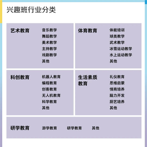 在行业实践中,兴趣班中大体上有艺术类兴趣班、体育类兴趣班、科创类兴趣班、生活素质类兴趣班及“研究性学习”和旅行体验相结合的研学教育等门类。