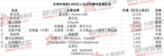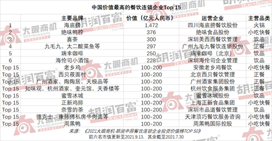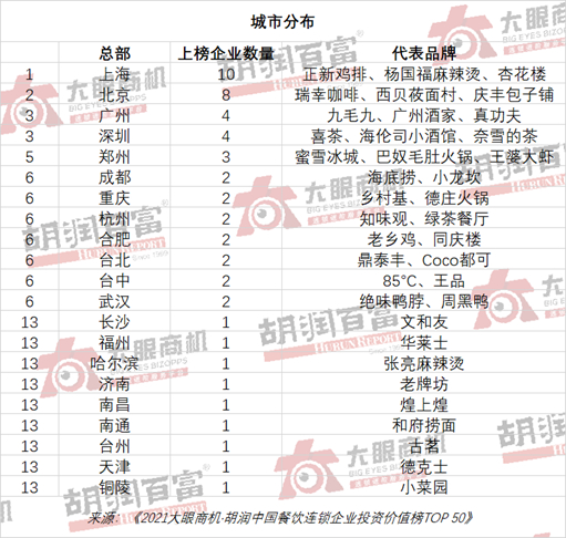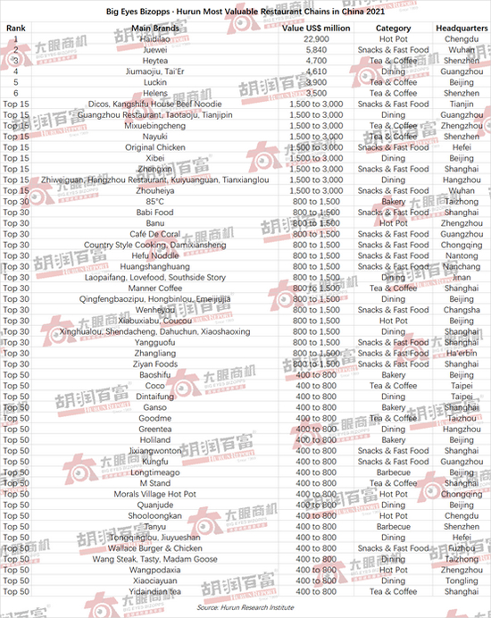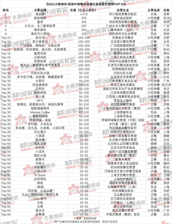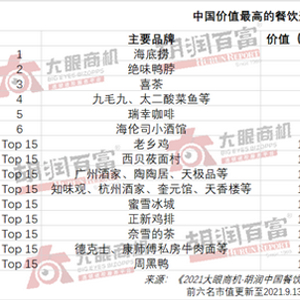 胡润研究院发布《2021大眼商机·胡润中国餐饮连锁企业投资价值榜TOP 50》