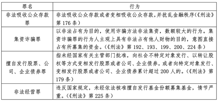 公司向员工集资一般属于普通的民间借贷关系或投资关系,并非一个明确的法律概念。但“非法集资”一词与集资不同,有着特定的法律含义。根据2021年国务院发布的《防范和处置非法集资条例》,“非法集资”是指“未经国务院金融管理部门依法许可或者违反国家金融管理规定,以许诺还本付息或者给予其他投资回报等方式,向不特定对象吸收资金的行为”。该定义系政府机关对“非法集资”的定义,但从司法领域,“非法集资”一词实际上涉及刑法中的四种罪名和四种犯罪行为: