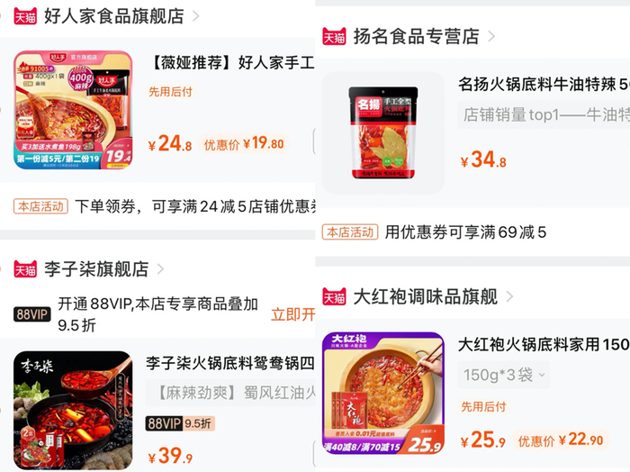 记者对比各火锅底料品牌电商旗舰店的价格发现,好人家与大红袍火锅底料约一斤装的实际价格大概在19-26元之间,而名扬火锅料与李子柒火锅底料,同样的重量,价格会上浮十几元。
