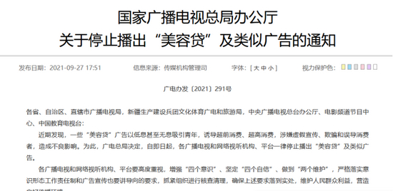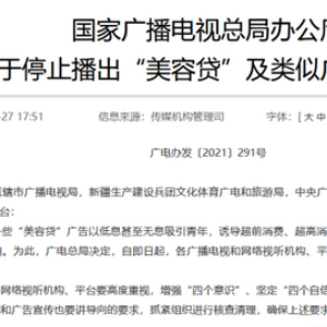 9月27日,国家广播电视总局办公厅发布关于停止播出“美容贷”及类似广告的通知。通知指出,近期发现,一些“美容贷”广告以低息甚至无息吸引青年,诱导超前消费、超高消费,涉嫌虚假宣传、欺骗和误导消费者,造成不良影响。为此,广电总局决定,自即日起,各广播电视和网络视听机构、平台一律停止播出“美容贷”及类似广告。