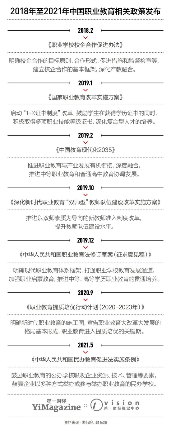 2019年年初,国务院发布《国家职业教育改革实施方案》,正式对职业教育动刀。这一方案的指导意见一共20条,因此又被称为“职教20条”。文件强调“职业教育与普通教育具有同等重要地位”,并提出要在5至10年内让职业教育完成由“政府主导”向“政府统筹管理、社会多元化办学”的格局转变。