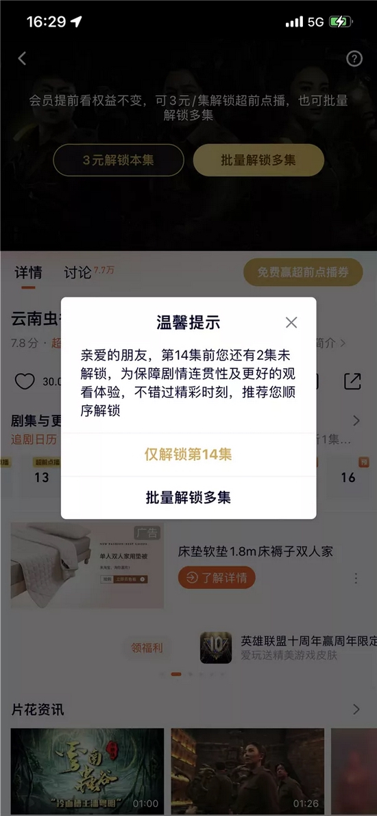 9月10日,腾讯视频正在热播的《云南虫谷》的超前点播已可选集解锁。针对批评,腾讯视频发布《关于优化超前点播服务的声明》,并表示会调整超前点播的解锁规则。