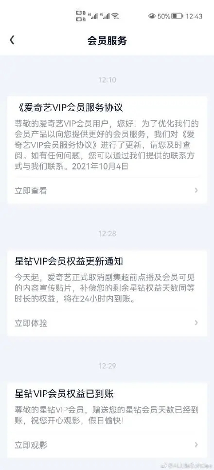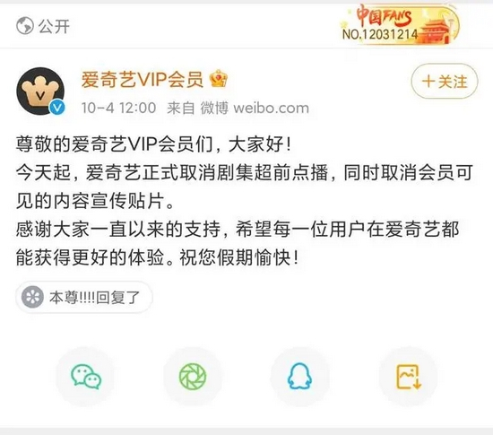 10月4日中午12点整,爱奇艺VIP会员官方微博宣布,今天起,爱奇艺正式取消剧集超前点播,同时取消会员可见的内容宣传贴片。